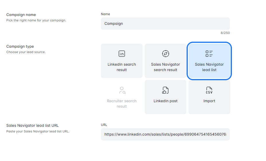 - Once you’ve filled your list with leads, it’s time to set up your campaign! Copy the URL of your Leads List, paste it into the designated area in the Leadsy, and give your campaign an awesome name.