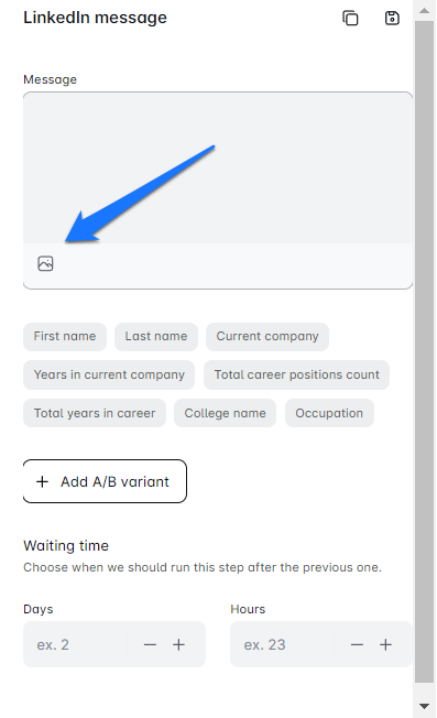 - For email messages, choose where to insert your image or GIF. For LinkedIn messages and InMails, Leadsy will place your personalized images and GIFs at the bottom of the message.