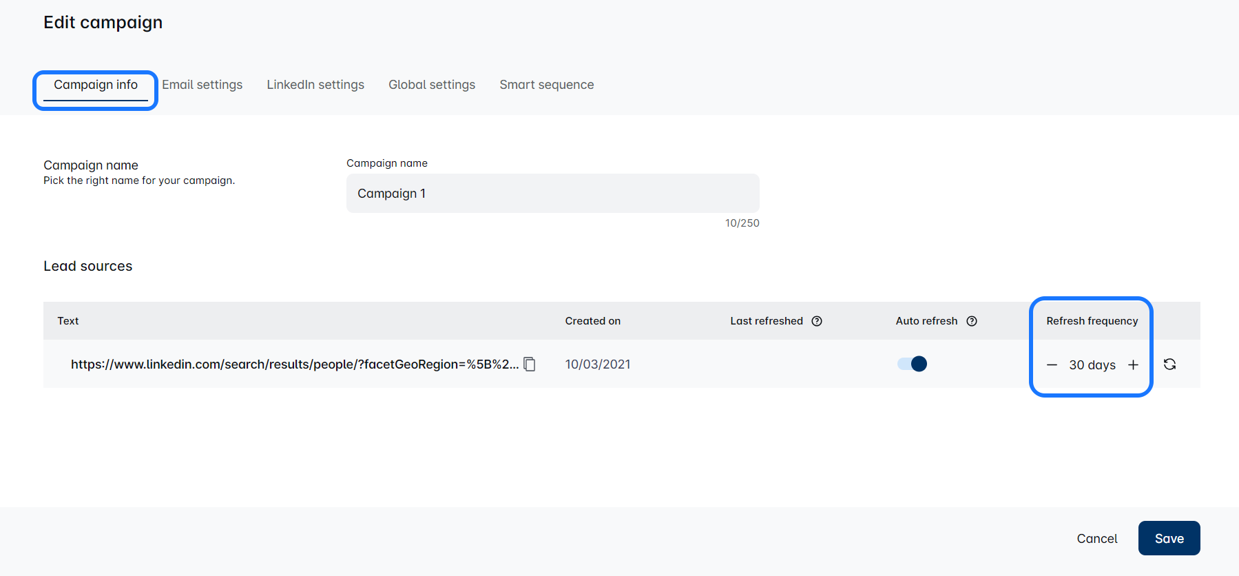 You can set up frequency for using this option by setting up days on how often should Leadsy refresh your search link.