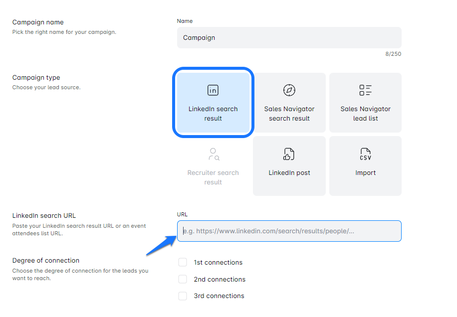 In Leadsy, paste your LinkedIn search URL into the designated area. Give your campaign a name that resonates with your goals.