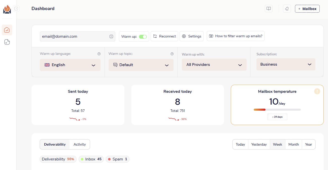 Builds trust with email providers: Warming up your account shows email providers that your activity is safe, helping more of your emails reach the inbox instead of getting flagged as spam.