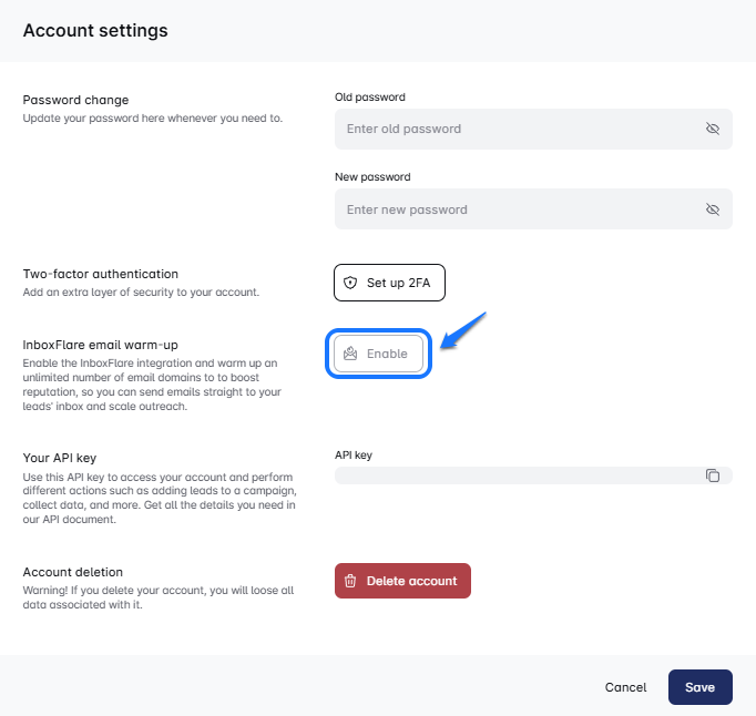 1. To start, you need to enable your InboxFlare account in Leadsy. Go to your Account settings in Leadsy and find the InboxFlare email warm-up. Click “Enable”.