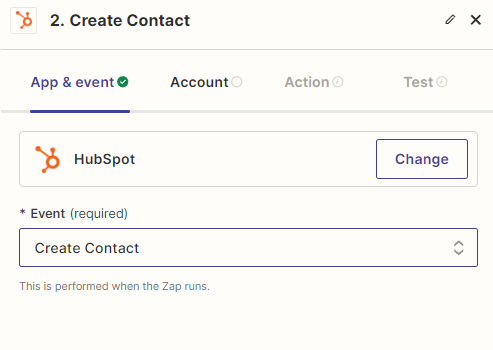 - Choose “Create Contact” in HubSpot as the action.