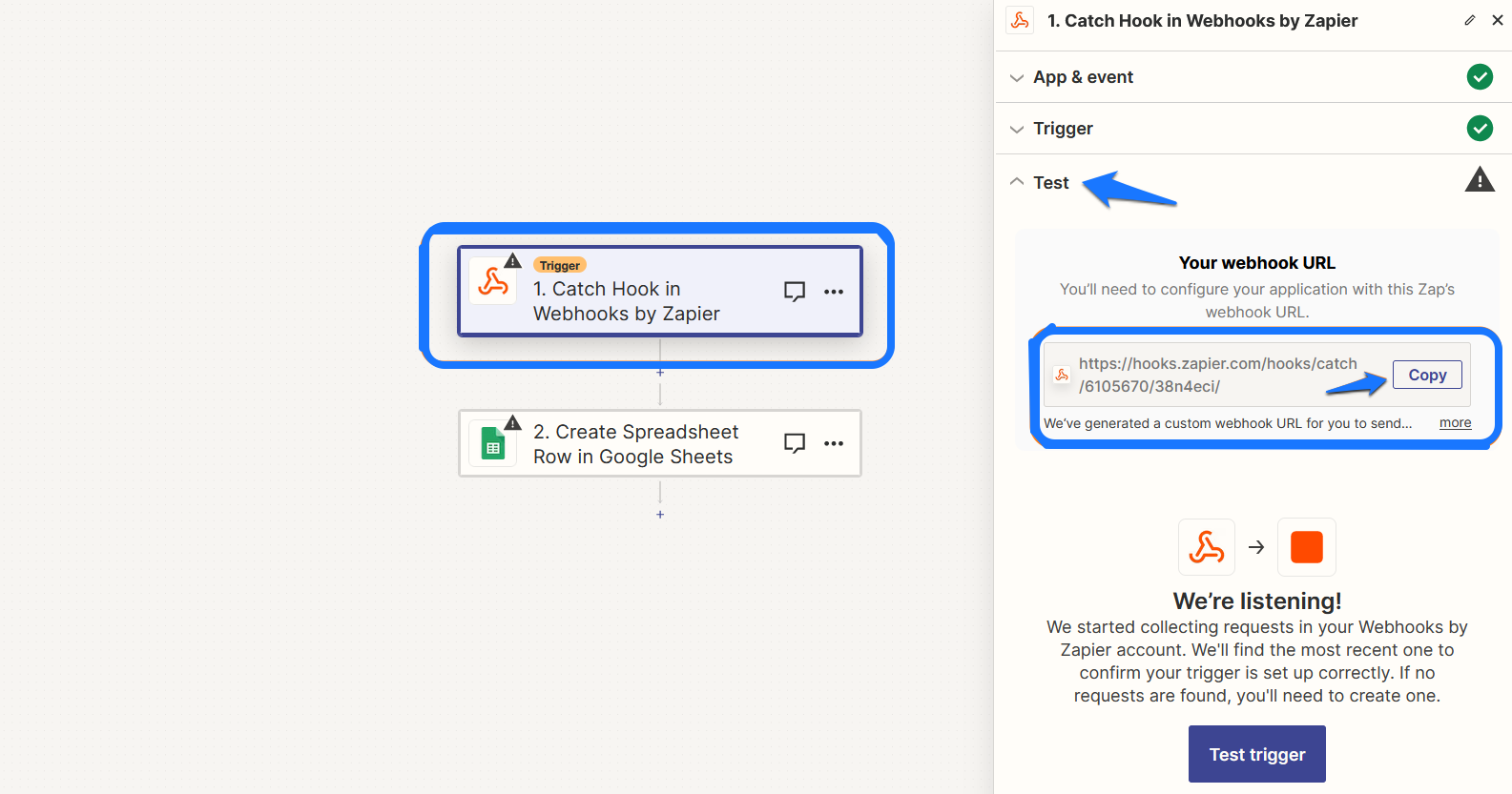 Zapier will suggest the best trigger based on your input. Click on the "Trigger" step, then go to Test and copy the URL Zapier generates for you.