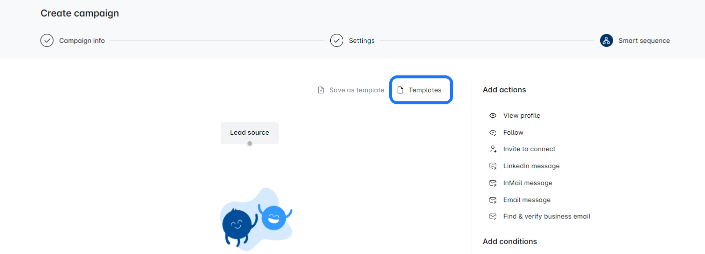 After configuring your campaign, hit ‘Next’ to reach the sequence builder page. Here’s where the magic happens! You can either pick from Templates or create your own.