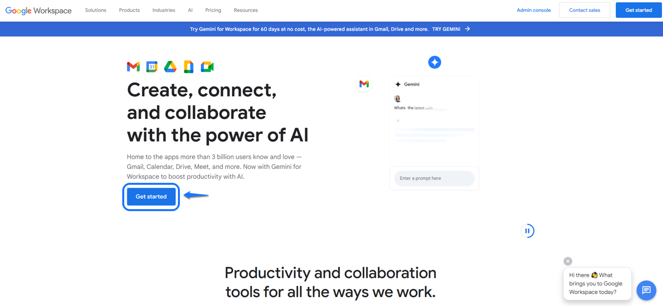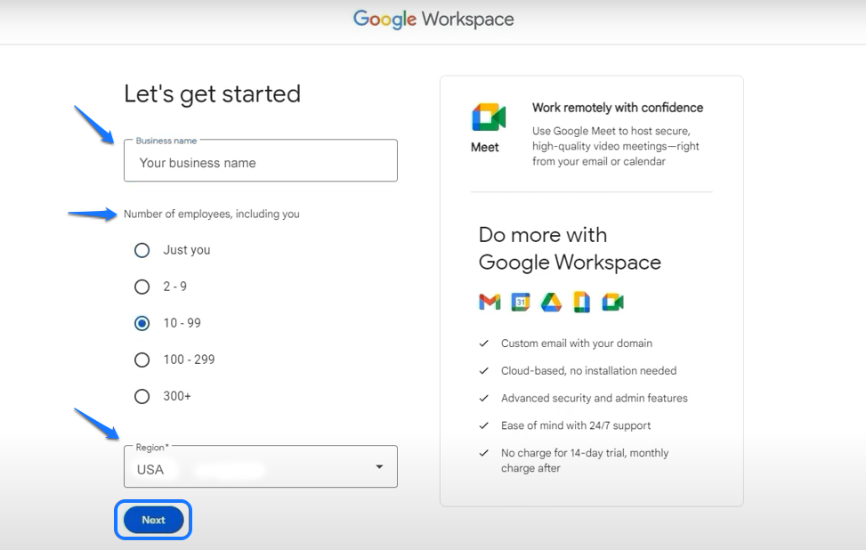 For this guide, we will use Google Workspace, and the flow is similar to all other workspaces. To begin, click on "Get started" and add the sign-up information.